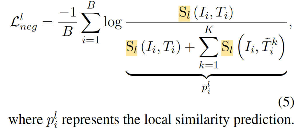 LHN Loss의 핵심은 원본 텍스트와 HN 텍스트 사이의 미세한 차이를 구분하는 것입니다. 이를 위해, 원본 텍스트에 대한 Local Similarity 예측 확률 p_l을 계산하여, HN 텍스트와 원본 텍스트의 차이를 세밀하게 구분할 수 있도록 하였습니다. 즉, LHN Loss는 Local Similarity를 계산할 때, 이미지 패치와 텍스트 토큰 단위로 유사도를 계산하기 때문에, global 벡터로 유사도를 구하는 기존과 다르게 더 디테일하고 정교한 학습이 가능한 것이죠. 글로벌 HN Loss인 수식 (4)를 저자가 제안하는 Local Similarity를 반영한 LHN Loss의 수식은 아래 (5)와 같습니다,입니다.
