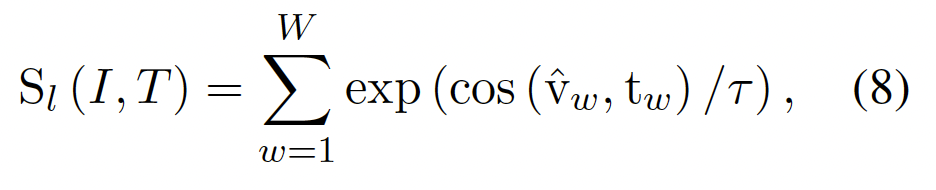 이렇게 텍스트 토큰과의 어텐션 웨이트를 적용한 이미지 패치와의 최종적은 Local Similarity는 아래 (8)과 같이 적용됩니다.