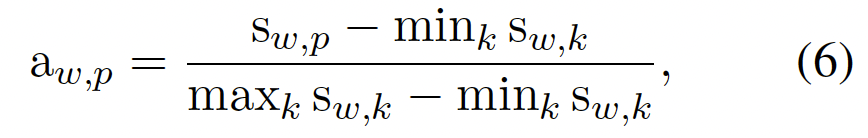 우선 토큰-패치에 대한 Similarity map인 s_{w, p}를 계산합니다. 이제 이를 가지고 attention weight 를 계산하는데, Similarity map에 대해 Min-Max normalize를 수행하여 가중치 a_{x, p}를 계산합니다. 이에 대한 수식은 아래 (6)에서 확인할 수 있습니다.