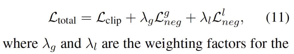 저자가 제안하는 최종 FSC-CLIP Loss는 아래와 같습니다. 바로 앞 챕터에서 설명한 SCR (focal loss, label smoothing)은 \mathcal{L}^g_{neg}, \mathcal{L}^l_{neg}에 모두 포함됩니다.