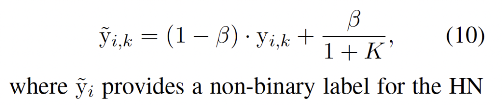 기존 방법은 HN 텍스트를 완전히 negative샘플로 간주하여, 모든 HN 텍스트의 레이블을 0으로 설정하였습니다. 그러나 이는 HN 텍스트가 원본 텍스트와의 유사함을 고려하지 않았기에, 학습 중 모델의 표현력을 손상시킬 수 있습니다. 따라서 저자는 HN의 레이블에 0이 아닌 아주 작은 양수값을 가지는 label smoothing 기법을 적용하였습니다.