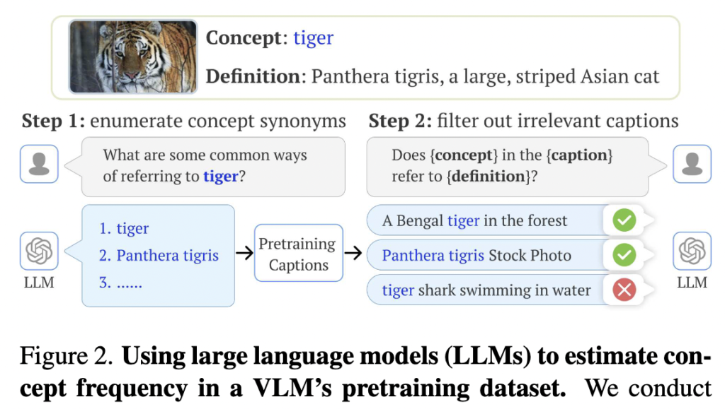 하지만 간단한 문자열 검색만으로는 정확도가 낮을 수 있습니다. 예를 들어 “tiger”라는 concept은 “Panthera tigris, a large, striped Asian cat”로 정의되지만, 검색된 텍스트에서 “tiger shark swimming in water” 또는 “Tiger Woods, a famous golf player”처럼 완전히 다른 맥락의 텍스트를 포함할 수 있습니다. 이를 해결하기 위해 Llama-2와 같은 최신 LLM에게 “Does {concept} in the {caption} refer to {definition}?”과 같이 질문하여 텍스트의 관련성을 판단합니다. 이러한 과정을 거쳐 관련이 없는 텍스트를 모두 제거한 후, 남은 텍스트만을 사용하여 concept의 빈도를 추정했습니다.