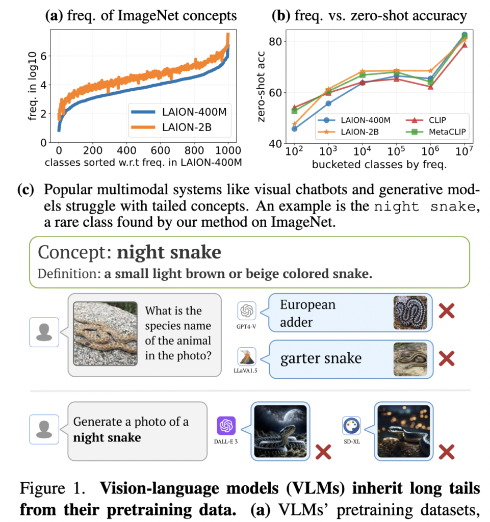 Vision-Language Models (VLMs)은 이미지와 텍스트를 결합하여 멀티모달 시스템을 구현하는 데 중요한 역할을 합니다. 대표적으로 CLIP과 같은 모델이 있는데, 이 모델들은 visual 챗봇이나 text-to-image generation 등 멀티모달 시스템에서 중요한 역할을 하고 있습니다. VLMs은 웹 규모의 이미지-텍스트 데이터셋(예: LAION)을 기반으로 훈련되어 이미지와 텍스트를 동시에 이해하는 능력이 뛰어납니다. 하지만 VLMs의 성능이 모든 상황에서 고르게 나타나지는 못합니다. 예를 들어, zero-shot visual recognition tasks에서 CLIP은 ImageNet의 1,000개 클래스에서 평균 80%의 정확도를 보였지만, 특정 클래스(예: night snake)에서는 10%보다 낮은 성능을 보였습니다. 이처럼 성능의 불균형은 VLMs의 중요한 문제임에도 불구하고 그동안 크게 주목받지 못했습니다. 많은 연구는 이러한 문제가 사전 학습 데이터의 편향 때문이라고 추정했지만, LAION과 같은 대규모 데이터셋의 concept frequency를 정확히 측정하는 방법이 없었기 때문에 이를 입증하기는 어려웠습니다.