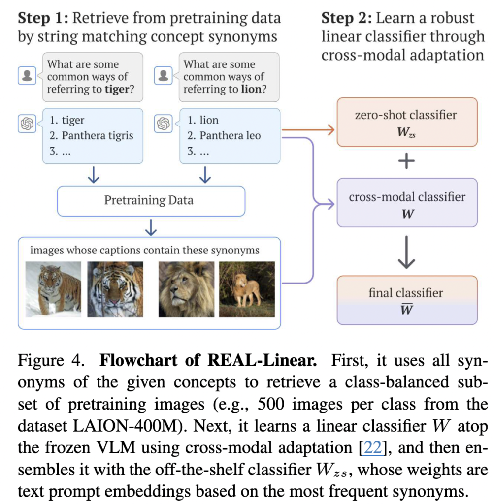 두 번째로 REAL-Linear는 VLMs의 성능을 개선하기 위해 다운스트림 데이터(추가 학습 데이터)를 사용하지 않고, 사전 학습 데이터를 재활용하는 방법입니다. 이 접근 방식의 핵심은 사전 학습 데이터에서 소규모이지만 balance한 이미지 집합을 구성해 이를 바탕으로 linear classifier를 훈련하는 것입니다. 기존의 방법(REACT 등)은 이미지나 텍스트의 특징을 계산하기 위해 VLMs를 사용했습니다. 이러한 특징 기반 검색(feature-based retrieval) 방식은 계산 비용이 높은 단점이 있습니다. REAL-Linear는 이를 대체하여 텍스트 기반 검색(string matching)을 사용합니다. 즉, 단순히 텍스트 검색을 통해 사전 학습 데이터에서 필요한 이미지를 찾아내는 방식으로, 효율성을 크게 높였습니다.