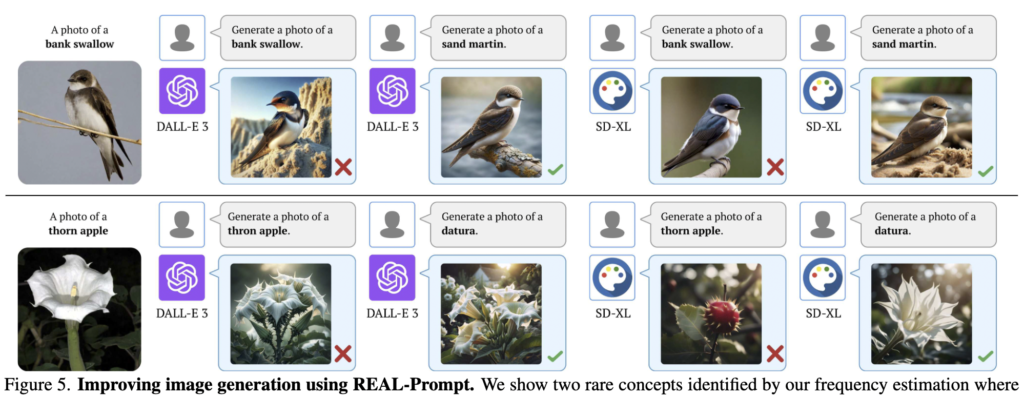 마지막으로 그림 5에서는 DALL-E 3와 SD-XL 같은 생성 모델이 일부 rare concept에 대해 올바른 이미지를 생성하지 못할 수 있음을 보여주는데 이를 REAL-Prompt를 통해 해결할 수 있음을 보여주고 있습니다.