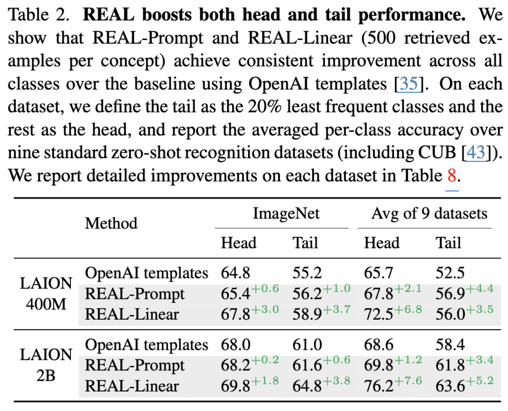 Table 2에서는 REAL은 ImageNet과 9개 데이터셋 평균에서 빈도가 낮은 tail과 (하위 20%)와 빈도가 높은 head(상위 80%) 모두에서 성능이 개선된 모습을 보여주고 있습니다.
