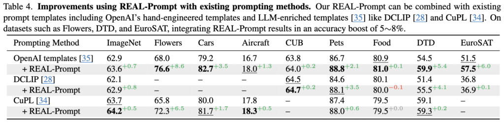 REAL은 기존 제로샷 방법에도 적용하여 성능을 향상시킬 수 있는 모습을 보여주고 있습니다. Table 4를 보시면 REAL-Prompt가 생성한 동의어를 DCLIP과 CuPL 같은 LLM 기반 프롬프트 템플릿에도 적용시켜 성능을 향상 시킬 수 있음을 보여줍니다.
