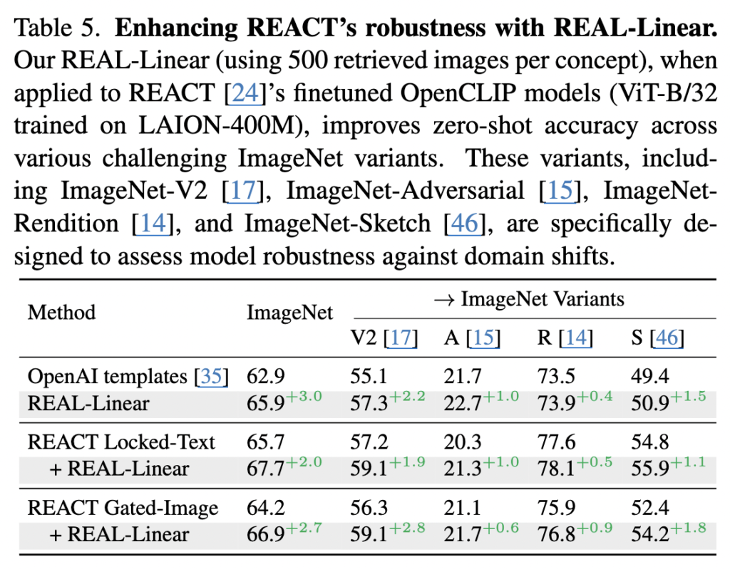 또한 Table 5에서 REAL-Linear는 REACT로 finetuning된 OpenCLIP 모델에서도 동작해 성능을 개선시킬 수 있음을 보여줍니다.