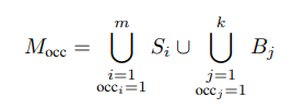 Occlusion Analysis 과정을 수식으로 나타내면 다음과 같습니다. 최종적으로 생성되는 Occluder Mask(대상을 가리고 있는 영역 마스크)인 M_occ는 InstaOrderNet을 통해 각각 객체 세그먼트(S)와 배경 세그먼트(B) 중에서 객체를 가리고 있는 마스크들을 찾아 (occ_i, occ_j = 1인 경우) 합집합을 생성합니다.