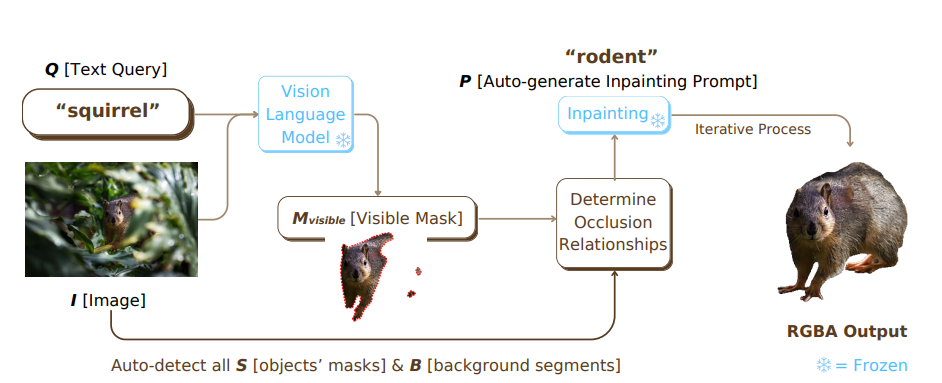 입력 이미지에서 가려진 객체를 복원해 RGBA를 생성하는 것이 목표인데요, 앞서 말했듯 자연어 쿼리를 입력으로 받아서 진행하게 됩니다. 저자는 자연어의 유연한 면을 활용해 복원 대상 객체를 추상적으로 지정할 수 있게 되면서 기존의 closed-set에서만 작동하는 기존 모델의 한계를 완전히 뛰어넘을 수 있고, 아래와 같은 파이프라인을 통해 end-to-end로 작동하는 모델의 구조를 설명합니다.
