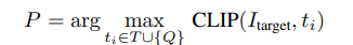 각 후보들에 대한 유사도는 위와 같은 식을 통해 계산됩니다. 이미지 상의 가려진 객체의 가시적인 부분만을 나타내는 I_target과 타겟을 설명하는 태그 후보 사이의 유사도를 CLIP 모델을 통해 구하고 가장 유사한 태그를 프롬프트 P로 활용합니다.