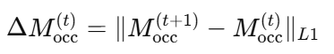 이 때 반복적인 inpainting을 진행하면서 다음 단계의 M_occ는 새로 복원된 영역을 포함하도록 바뀌고, 대상 객체의 경계를 정의하기 위해 M_amodal도 갱신됩니다. 또한 계산을 효율적으로 하기 위해 아래와 같은 식을 통해 지난번 inpainting 결과와 해당 결과의 occluder 마스크의 픽셀 차이가 임계값 보다 낮거나 정해진 횟수에 도달하면 inpainting 과정을 종료합니다.