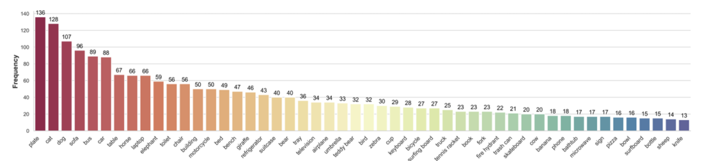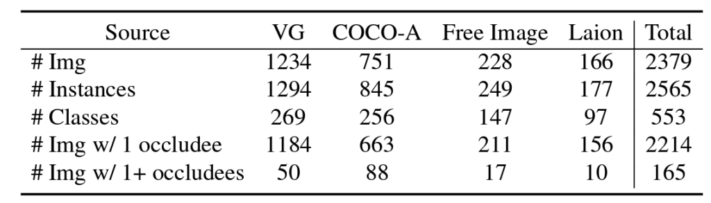 기존의 amodal completion은 사용한 데이터셋에도 한계가 있었는데요, 다른 amodal completion 논문에서도 말했듯 기존의 amodal completion을 위한 데이터셋은 객체의 카테고리가 제한적이고 합성데이터를 사용해 occlusion을 만들기 때문에 실제 환경의 복잡성을 잘 반영하지 못했습니다. 저자는 이런 문제를 해결하기 위해 위와같이 50개 이상의 카테고리가 존재하는, open world의 복잡함을 다룰 수 있는 데이터셋을 구축했다고 합니다. 평가 데이터셋을 COCO-A, Visual Genome, LAION, 저작권이 없는 공공 웹사이트에서 다양하게 수집해서 아래 표와 같이 출처에 따라 다른 특성의 데이터들을 정리했다고 합니다.