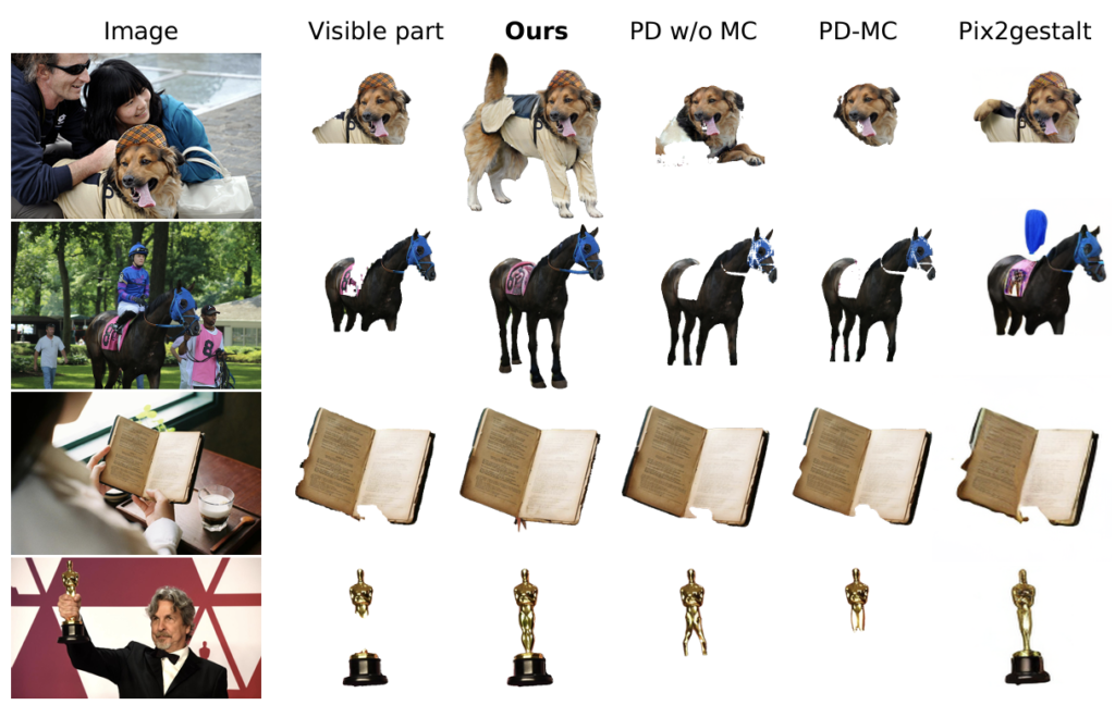 위와 같이 정성적인 모습을 봐도 개와 말 등을 기존의 다른 방법들보다 훨씬 잘 복원합니다. pix2gestalt의 논문을 봤을때는 비슷한 케이스에서 복원이 잘 됐던 것 같은데, 잘 될때가 있고 안 될때가 있는 것 같습니다. 저자는 오스카상이나 책과 같은 경우를 따져봤을 때도 다른 방법들이 놓친 구조적인 세부사항을 놓치지 않고 완벽하게 복원해냈다는 점을 어필했습니다. Pix2gestalt 방법도 오스카상의 형상을 잘 복원하는 것을 보면 확실히 Global Context와 Local Context를 같이 활용하는 방법들이 더 성능이 좋은 것 같습니다.