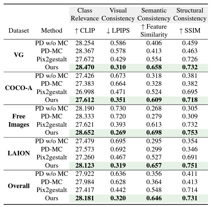 다른 모델들과 비교를 진행할 때는 180명의 참가자를 Prolific 클라우드소싱 플랫폼에서 구해 선호도를 조사했고, 이와 기존의 정량적 평가 metric을 통해 Pix2gestalt, PD-MC(Progressive Diffusion – Mixed Context), mixed context diffusion을 하지 않은 PD w/0 MC 와의 비교를 진행했습니다. 원본 이미지와 4가지 방법으로 복원된 이미지들을 무작위 순서로 배열해서 평가를 진행했고, 데이터 신뢰성을 보장하기 위해, 명확한 선택을 요구하는 gold standard 질문을 포함했으며, 이 검사를 75% 이상 통과한 참가자들만 최종 분석에 포함했다고 합니다. gold standard질문은 평가에는 활용하지 않고 명확한 정답이 있는 질문으로 구성해 선호도가 아닌 정답을 찾아서 참가자의 능력을 평가하는 요소입니다. 결과는 아래 표와 같이 평가 데이터셋에서 가장 높은 인간의 선호도를 기록했습니다. 다양한 데이터셋에서 1위를 기록했기 때문에, 모델의 강건성도 입증한다고 주장합니다.