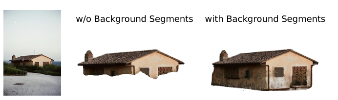 텍스트 쿼리 Q만 사용한 경우, LISA로 생성된 auto generated tags T만 사용한 경우, T와 Q를 같이 사용한 경우를 비교해 봤을 때 객체정보와 문맥정보를 비교한 경우 위 표와 같이 확실히 높은 시각적, 의미적, 구조적 향상이 있었습니다. 모호한 배경 B를 처리하는 단계도 의미가 있었는데, Background Segmentation을 진행해서 occlusion을 더 면밀하게 정의 했을 때 쿼리 객체와 주변 환경 (땅, 하늘, 나뭇잎)등과의 scene understanding이 증가했다고 합니다. 배경이 있는 곳에서는 확실히 아래와 같이 주변 자연요소들에 가려져있다는 것을 인지하고 잘 복원하는 모습을 보여줍니다. 뿐 만 아니라 카메라 초점이 이상해서 흐려진 부분에 가려진 경우에도 모호한 부분에 대한 처리가 가능해서 Background Segmentation을 하지 않았을 때와 비교되는 모습을 보여줍니다.