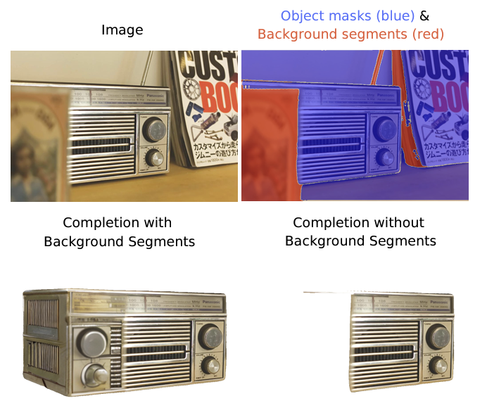 저자는 현실 세계에서 여러 물체들이 다른 물체들에 의해 가려지는 경우가 흔하고, 이를 증강현실이나 3D 모델링 등에 활용하기 위해서는 amodal completion이 필요하다고 문제를 정의합니다. 또한 기존의 amodal completion 방법론들은 closed set에서 작동한다는 것과 다양한 환경에서 강건하게 적용할 수 없다는 한계가 있다고 정의하고, 현실 영상의 다양한 시각적 특징을 가진 객체들을 유연하게 지정할 수 있도록 자연어 쿼리를 사용했습니다. 저자가 해당 문제를 해결하기 위해서 제시한 방법은 크게 세가지 인데요, 첫 번째로 Reasoning Amodal Completion이 있고, 두 번째로는 Segmentation, Occlusion Analysis, Inpainting을 한 프레임워크로 통합했다는 점입니다. 마지막으로 복원된 객체를 RGBA (RGB + 투명도 alpha) 요소로 출력해 AR, 3D Reconstruction등에 통합 가능하도록 구성했습니다.