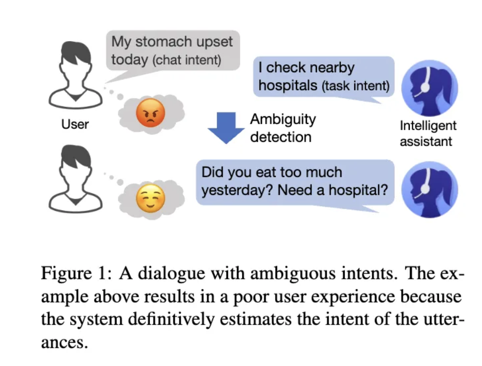 Figure 1을 예로 들어보겠습니다. 사용자가 “My stomach upset today”라고 말하는 상황에서, 사용자는 대화(chat)을 하기 위한 의도로 해당 발화를 하였는데, Intelligent assistant의 경우, task intent로 의해하여 바로 병원을 찾겠다 라는 멘트를 발화합니다. 발화에서 사용자의 의도가 정확하게 들어내지 않아 모호함으로 인해 잘못 명령을 수행한 것입니다. 하지만 모호함을 detection하여 이를 반영하면 사용자의 의도에 맞게 “Did you eat too much yesterday? Need a hospital?”이라고 발화하는 것을 확인할 수 있습니다.
