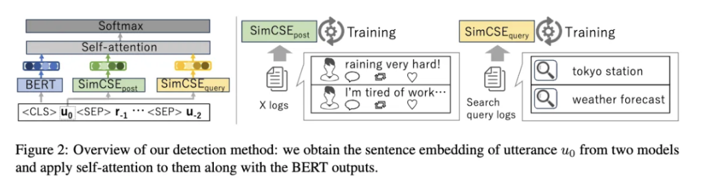 detection 단계에서, self-attention mechanism을 $SimCSE(u_0){query}, SimCSE(u_0){post}, BERT((u_0,r_{-1},u_{-2},r_{-2},u_{-2}))$에 다음과 같이 적용합니다.