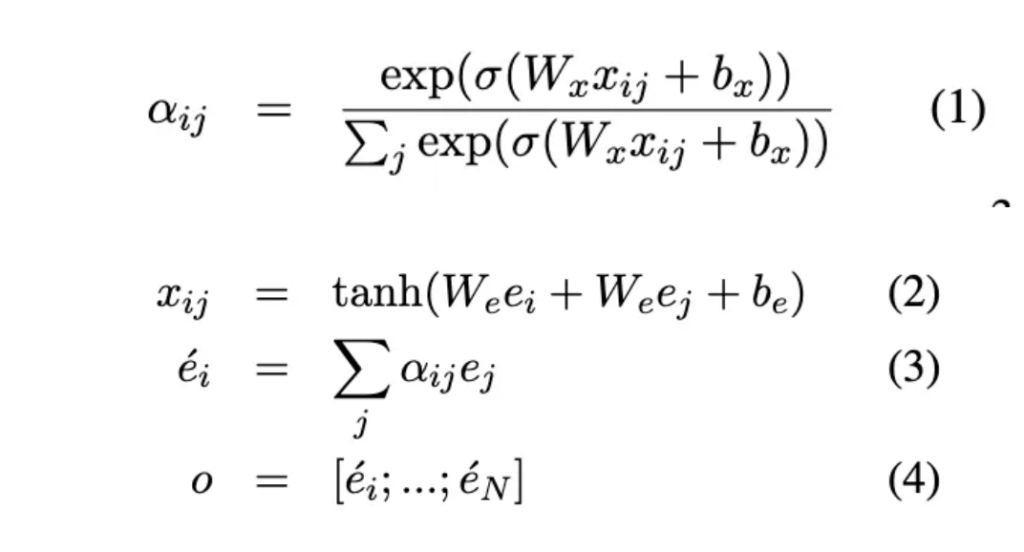 위에 방법에 대해서 설명하자면, 먼저 각각 $e$가 BERT 임베딩과 문장 임베딩을 나타내는 경우에 대해서 $x_{ij}$와 $e_i,e_j$간의 유사성을 얻습니다. 그런 다음 feed-forward network로 구성된 additive attention을 사용하여 alignment 점수를 계산합니다. 그런 다음 softmax 함수를 상용하여 importance weight $\alpha_{ij}$를 계산합니다. 결과적으로 얻은 $\bar{e_i}$는 concat하여 output $o$로 사용됩니다.