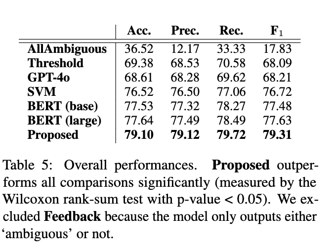 먼저, Table 5를 통해 제안된 방법론과 다른 방법론 간의 성능 차이를 볼 수 있습니다. 여기서 All ambigous란 것이 조금 생소하실텐데, 모든 선택지에 대해서 ambigous라고 응답한 것을 의미합니다. 제안된 방법론의 경우 다른 방법론들과는 월등하게 성능이 높게 나오는 것을 알 수 있는데, 조금 신기하게 봤던 부분은 GPT-4o에 비해서 BERT의 성능이 높게 나왔다는 점입니다.