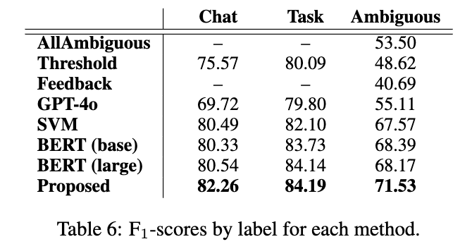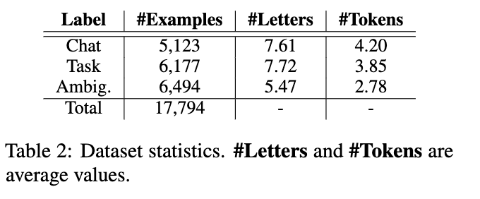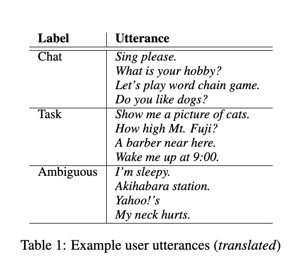 Table 1을 보면 해당 발화가 어떻게 labeling 되는지 파악할 수 있습니다. Chat, Task, Ambigous로 라벨링되며, Chat의 경우 사용자와 시스템이 대화하는 것을 의미하고, Task의 경우 해당 발화를 통해 어떠한 행위를 수행하는 발화를 의미합니다. Ambigous의 경우, Chat이나 Task와 달리 명확하게 구분되지 않는 발화를 말하는데, “I’m sleepy”와 같은 발화를 의미합니다.