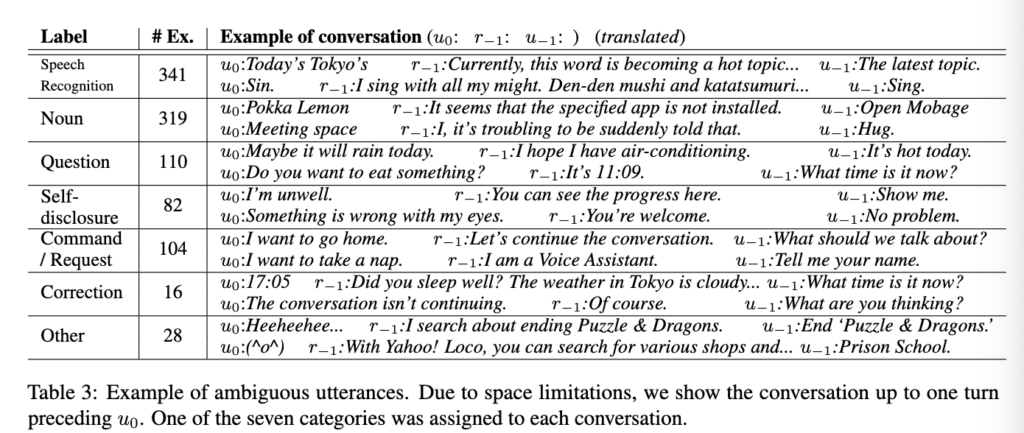 모호한 발화에는 두 가지 유형이 있습니다. 특정 task 의도가 어떤 것인지 분명하지 않은 경우(예를 들어, 지도 검색 혹은 웹 검색에서의 “University of Tokyo”)와 task 의도와 chat 의도 간의 구분이 명확하지 않은 경우(예를 들어, “I have a headache”라는 문장에 대해서 근처 병원을 검색할지 혹은 대화를 위한 자기 표현인지 구분하기 어려움)가 있습니다. 본 논문에서는 이러한 경우를 모두 ambiguos로 라벨링 하였습니다.