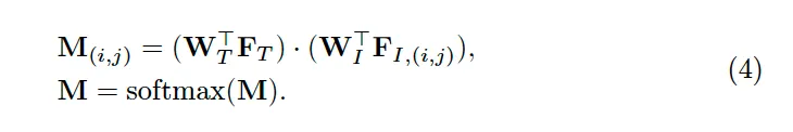 식 4를 보면 이 과정이 나와있는데 두 feature간의 내적을 통해 activation map을 생성하게 되고 이후에 softmax를 태워 binary가 아닌 0~1사이의 연속적인 값을 갖는 map을 뽑은 것입니다.