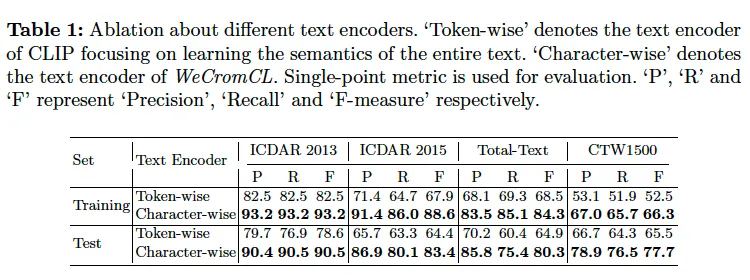 먼저 WeCromCL의 character-wise text encoder와 기존 CLIP의 token 기반의 text encoder를 비교하는 실험입니다. 실험은 WeCromCL의 text encoder를 CLIIP의 text encoder로 대체한 후에 transcription detection 성능을 비교해보았습니다. CLIP text encoder를 사용했을 때 “There is a word ‘transcription’”이라는 prompt를 일관되게 사용했구 여기서 ‘transcription’부분에는 gt text가 들어가게 됩니다.