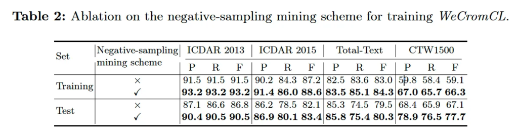 다음으로는 저자가 제안한 negative sample을 선정하는 방식에 대한 ablation study 결과입니다. 이때 negative-sample mining 기법을 적용했을 때와 적용하지 않았을 때의 anchor point detection 성능을 비교한 결과가 표2에 나와있는데요. 봤을 때 앞선 character-wise text encoder보다는 성능차이폭이 대체로 크지는 않지만 그래도 negative sample mining 기법을 적용했을 경우 성능 향상을 보입니다. 다만, CTW1500 데이터셋에서 10% 정도의 성능 향상을 보이는 부분은 흥미로운 점인 것 같습니다.
