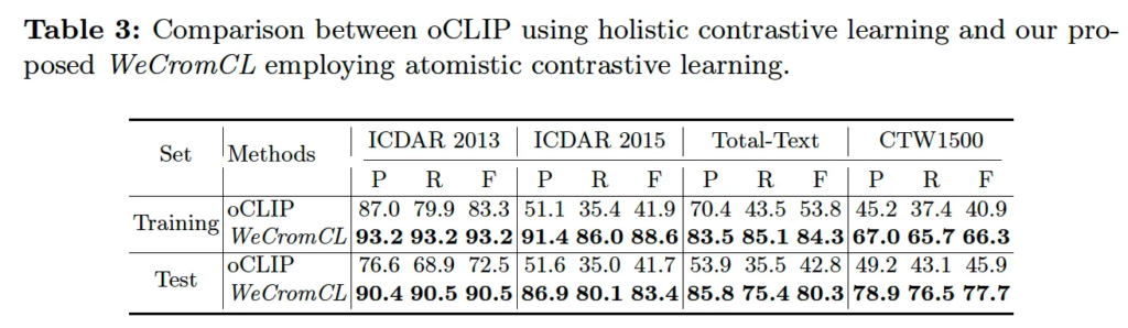 무튼, 이 oCLIP과 WeCromCL을 비교하기 위해 oCLIIP을 weakly supervised 방식으로 변형하였습니다. 구체적으로, 예측된 masking된 문자에 대한 attention map을 aggregate한 후에 이 map 중 가장 활성화된 pixel을 픽하여 이 transcription에 대한 location으로 본 방식을 사용하였습니다. 결과는 위 표3에서 확인할 수 있는데, 적게는 18부터 많게는 40에 육박하는 성능 차이를 보임을 확인할 수 있습니다. 다만,, oCLIP의 원래 설계 목적 자체가 WeCromCL과는 근본적으로 다륵게 weakly supervised text detection을 수행하도록 최적화되지 않았기 때문에 compare한 비교로 보기는 살짝 어려워 보이기도 하고, 나름 weakly supervised 방식으로 oCLIP을 개조하기 위해 attention map을 aggregated 하는 방식을 사용했지만 이 임의의 방식이 최적의 모델 성능을 이끌어내지 못하는 구조일수도 있음을 고려하여 실험 결과를 봐주시면 될 것 같습니다.