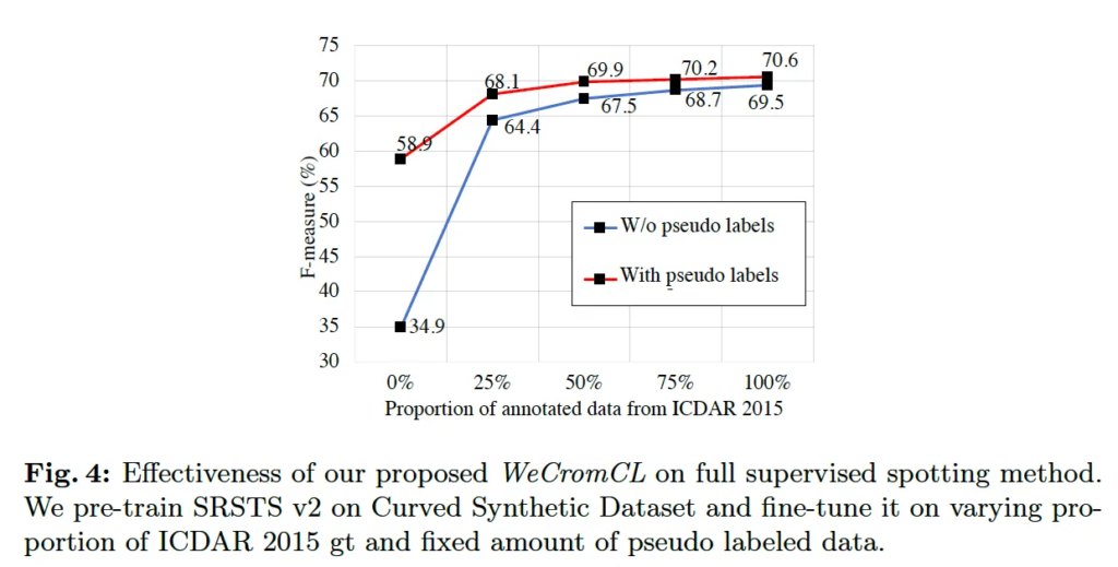 이를 수행하기 위해 먼저 MLT, ICDAR2013, Total-Text, TextOCR 데이터셋에 대해 pseudo location label을 생성하였구요, 기존 single point를 기반으로 text recognition을 수행할 수 있는 모델을 사전학습 했습니다. 그 후 ICDAR2015 데이터셋에 대해 fine-tuning할 시 실제 annotation 데이터셋을 점진적으로 증가시키면서 모델을 학습하였구요, 동시에 WeCromCL이 생성한 pseudo label데이터를 일정량 추가하여 성능에 미치는 영향을 확인하였습니다.
