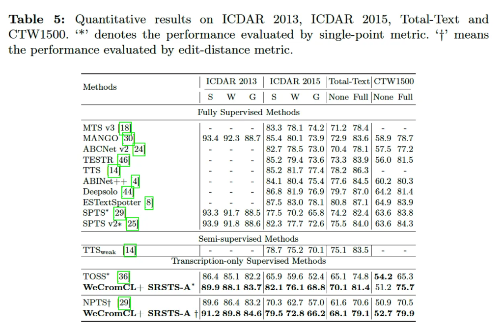 마지막으로 WeCromCL과 SRSTS-A(single point 기반으로 spotter를 수행하는 모델)을 합쳐 transcription-only supervised text spotting 성능을 평가하고 마무리하도록 하겠습니다. 표5에서 결과를 확인할 수 있는데 제안된 방식이 다른 transcription only supervised 모델인 TOSS나 NPTS와 비교했을 때 더 좋은 성능을 보입니다. 특히 ICDAR 2015에서는 NPTS대비 약 16%, TOSS 대비 9% 정도로 꽤나 큰 차이를 보입니다. 물론 fully supervised method 대비 성능이 떨어지기는 합니다. 다만, 중간에 있는 semi supervised method인 TTSweak는 text boundary가 포함되어 있는 fully supervised synthetic data와 transcription이 주어진 real data로 학습된 모델인데, 이 모델과 견줄만한 성능을 보이고 있습니다.