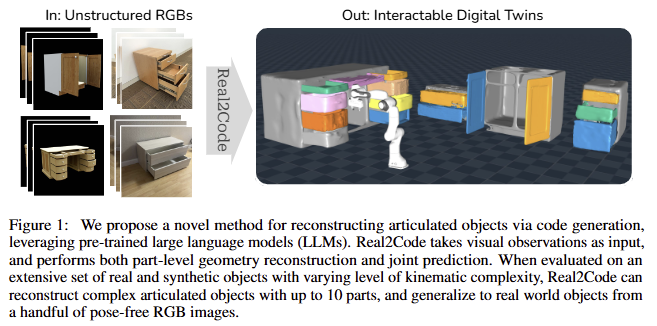 - 소수의 비정형 RGB 이미지에서 관절형 객체를 재구성하는 새로운 접근 방식인 Real2Code를 제시합니다. 관절 예측을 코드 생성 문제로 공식화하고 사전 훈련된 대규모 언어 모델을 이 작업에 특화되도록 조정합니다.