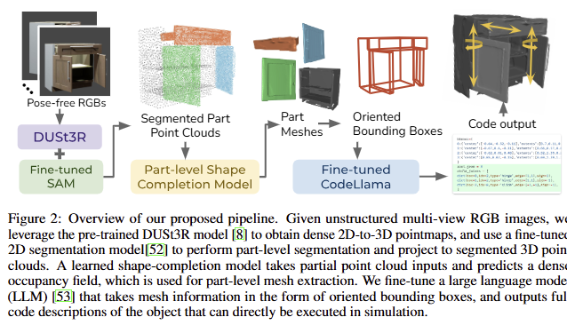 간단하게 설명하자면 영상 기반으로 촬영된 객체를 최신 feature matching 기법인 Dus3tr를 이용해 3차원으로 재구성을 수행하고 객체의 부품들을 이해하기 위해서 SAM을 이용합니다. 이렇게 구분된 정보들은 저자가 제안하는 구성을 통해 프롬프팅 되어져 Multi-modal LLM의 입력되어집니다. 이때 LLM은 풍부한 지식을 통해서 객체의 관절형 구조를 해석하고 해당 구조를 코드 레벨로 구성하여 시뮬레이터 공간에서 실제 객체의 움직임을 모사 가능한 결과물을 보여줍니다.