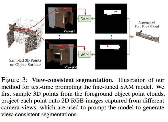 - Multi-view RGB-D and Camera Input: 먼저 각 RGB 이미지에서 2D 포인트를 대략적으로 샘플링하고 SAM 모델을 실행하여 배경 마스크를 얻습니다. 이를 통해 서로 다른 뷰에서 전경 객체를 분할하고 포인트 클라우드에서 3D 포인트를 균일하게 샘플링할 수 있습니다. 그런 다음 각 3D 포인트를 각 이미지에 다시 투영하고 SAM 프롬프트에 대해 뷰 일관성 있는 2D 포인트를 얻습니다(fig 3 참고). 또한 confidence and stability scores를 기반으로 모델 예측 마스크의 순위를 지정하고 NMS를 통해 최종 3D 분할을 생성합니다.