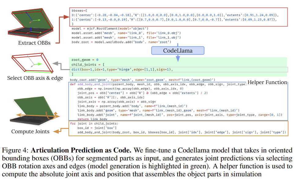 해당 챕터에서는 부품을 연결하는 관절 구조를 예측하는 것을 목표로 합니다. LLM 코드 생성을 사용하는 이 접근 방식은 몇 가지 이점을 제공한다고 합니다. 첫째, 코드는 관절을 위한 간결한 표현이며 객체의 운동학적 구조의 복잡성에 따라 예측 길이가 달라지는 것을 유연하게 대응 가능합니다. 둘째, 사전 훈련된 LLM에는 객체에 따른 상식적인 사전 지식과 이에 대한 올바른 코드를 생성하기 위한 강력한 사전 학습 능력이 갖춰져 있어 이 작업에 쉽게 적용할 수 있습니다. 마지막으로 LLM에서 생성된 코드는 시뮬레이션에서 직접 실행할 수 있으므로 이전 연구에서 요구하는 예측된 관절 매개변수를 수동으로 정리할 필요가 없다는 장점을 가집니다.