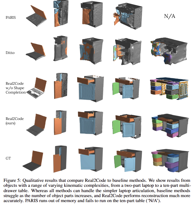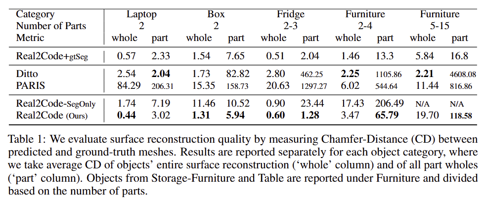 부품 수의 증가에 따라 압도적인 성능 차이를 보여줍니다. 또한 Real2Code-SegOnly 중 N/A의 결과는 세부 부품에 대한 SAM의 표현 민감성에 따라 노이즈가 발생하여 발생한 결과로 shape completion model의 필요성을 보여줍니다.