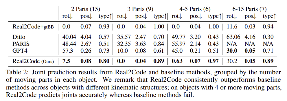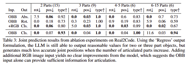 Regression on Joint Parameters. OBB 회전 축과 에지를 선택하는 대신 동일한 입력을 받지만 관절값에 대해 연속적인 수치 값을 출력하도록 두 개의 CodeLlama 모델을 추가로 미세 조정. 첫 번째 모델은 각 조인트 축에 대해 3개의 값을 직접 예측하고(tab 3의 ‘OBB Abs.’), 두 번째 모델은 Real2Code와 동일한 방식으로 조인트 축을 예측하지만 조인트 위치를 OBB의 중심에 대한 상대 위치로 예측(tab 3의 ‘OBB Rel.’).