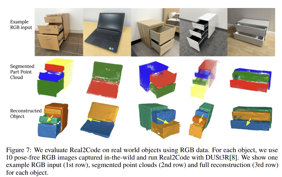 비정형적인 실제 환경에서는 정확하고 정돈된 깊이 및 영상 정보를 얻기 어렵다는 문제가 있습니다. 저자는 이를 해결하기 위해 사전 훈련된 dense stereo reconstruction model인 DUSt3R을 파이프라인에 통합합니다. DUSt3R에서 예측한 dense 2D-to-3D point map이 미세 조정된 SAM 모델과 결합하여 view-consistent 3D segmentation을 달성할 수 있음을 보여줍니다. 결과적으로 Real2Code는 카메라 포즈 정보 없이 실제 객체를 촬영한 소수의 RGB 영상만으로도 재구성할 수 있음을 보입니다.