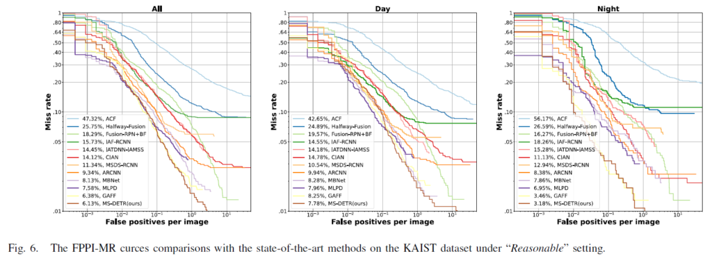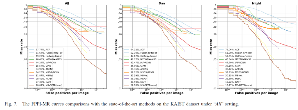 더욱이, “Reasonable”및 “All” 세팅에서 FPPI-MR 커브를 나타낸 그림 Fig 6, Fig 7를 참고하면 Reasonable 세팅에서 저자들의 MS-DETR이 넓은 범위에서가장 작은 Miss Rate를 기록해 밤 상황의 성능을 상당히 개선했음을 확인할 수 있으며, All 세팅에서 는 주/야간 모든 상황에서 타 방법론들보다 좋은 결과를 보여주고 있습니다.