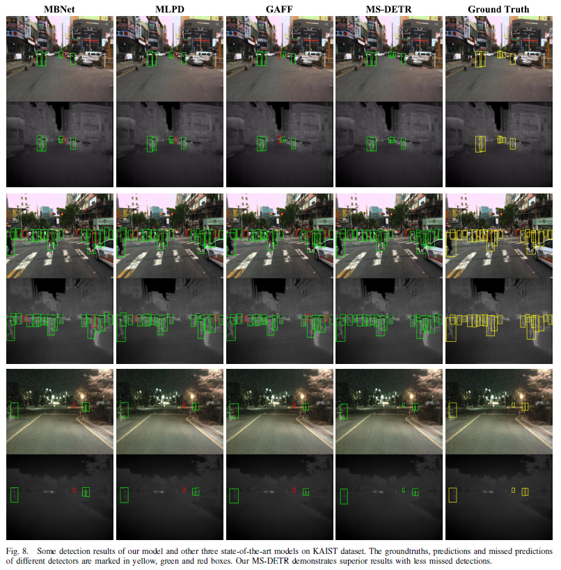 마지막으로, Fig 8에서는 몇몇 detection 결과를 시각화하여 나타내었습니다. 노란 박스는 GT를, 초록 박스는 MBNet, MLPD, GAFF, MS-DETR의 검출 결과를 나타낸 것입니다. 빨간 사격형은 검출 결과 놓친 것을 나타낸 것입니다. 다른 검출기의 경우 몇몇 보행자를 놓쳤지만, MS-DETR은 매우 높은 검출률을 보여주는것을 확인할 수 있습니다.