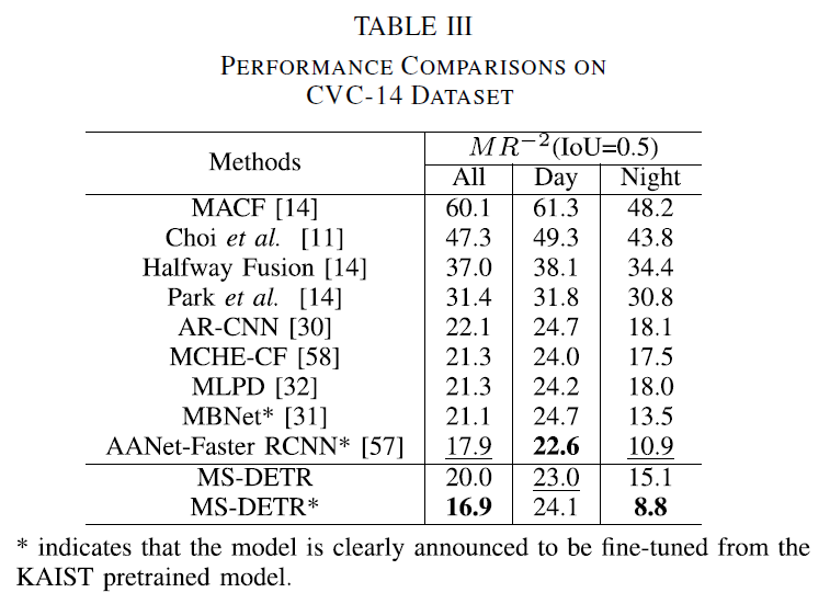 CVC-14 데이터셋에서는 특이하게 KAIST로 사전학습을 하고 CVC-14로 fine-tuning을 진행했다고 합니다. 결과는 Table 3에서 확인할 수 있습니다. CVC-14 데이터셋의 경우에도 MS-DETR은 All, Night에서 가장 좋은 결과를 보여주었습니다. day에서 성능 저하가 일어나는것이 loosely coupled fusion strategy에서 selected point들만 고려하는 과정에서 텍스쳐 정보 일부가 손실되어서 그런 것으로 분석된다고 합니다. 해당 방법론에는 딱히 추가적인 alignment를 위한 요소가 없음에도 비교적 낮은 miss rate를 보여주며, 특히 Night 검출 결과가 좋은 것ㅇ르 강조합니다.