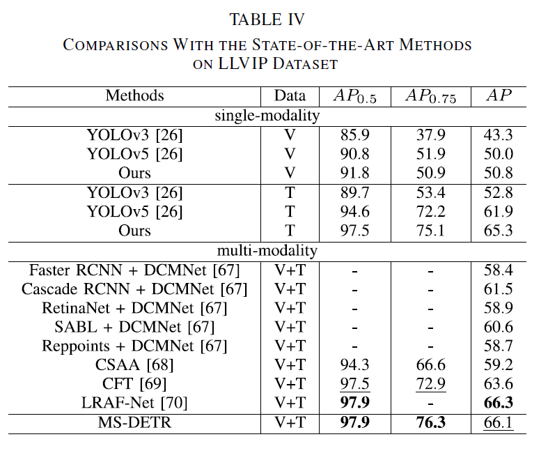 마지막으로 LLVIP에 대한 실험 결과는 Table 4에 나타내었습니다. 해당 데이터셋은 주로 Average Presicion(APiou)를 주로 사용하는 듯 하네요. 해당 실험에서는 단일 모달리티 모델 검출 결과도 함께 나타내었습니다. LLVIP가 야간 장면 데이터셋인 만큼, 전반적으로 thermal의 검출 결과가 비교적 우수하다고 합니다. 멀티모달 세팅에서는 SOTA인 LRAF-Net과 겨의 견줄 수 있는 성능을 내었습니다. 여기서는 단일 모달리티의 성능이 다른 모델들의 멀티스펙트럴 성능에 견주거나 우수함을 어필하며, DETR 기반 멀티스펙트럴 검출기의 가능성을