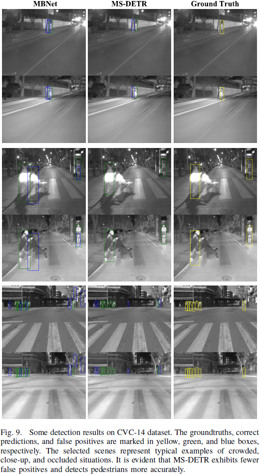 CVC-14에 대한 시각화 결과는 Fig.9에 나타내었습니다. GT, True Positive, False Positive 박스를 각각 노랑, 초록, 파란색으로 나타내었습니다. 논문에서는 MBNet과 비교하여 False Positive 의 비율이 적다는 것을 강조하고 있습니다.