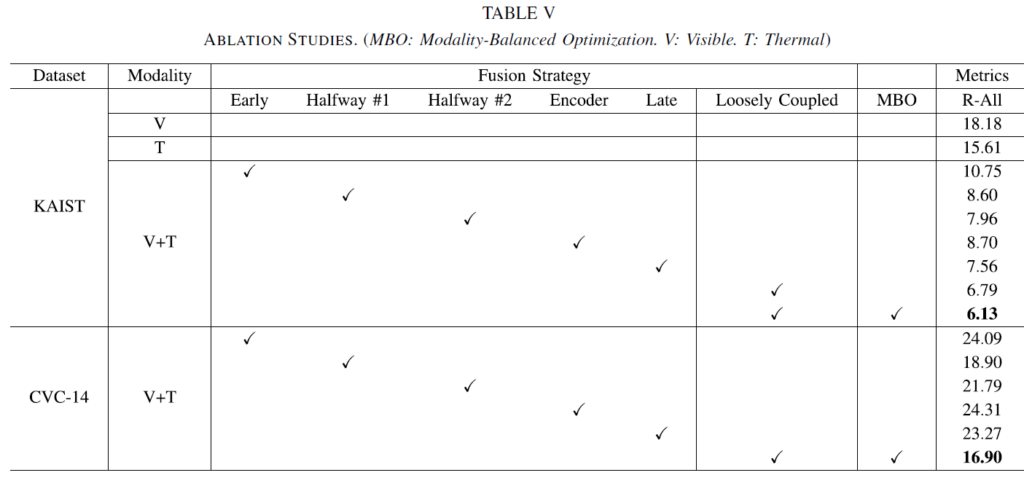 훈련 과정에서 visible, thermal, fusion branch를 보존하는데, modality-balanced optimization 이후에는 3 branch 모두 각각 정확한 탐지 결과를 얻을 수 있습니다. 따라서 추론 단계에서는 3개의 branch 중 하나를 사용하면 됩니다. 저자들은 기본적으로 fusion branch를 사용했다고 합니다.
