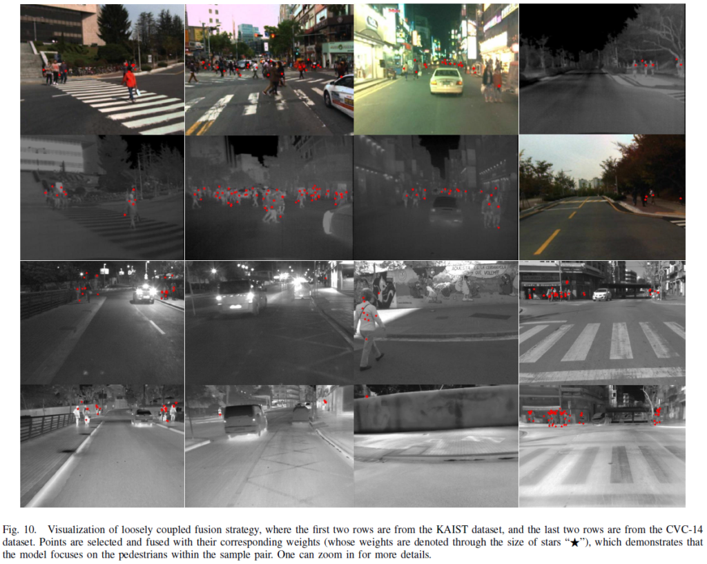 test set에 대한 MS-DETR의 selected point를 시각화하여 Fig.10에 나타내었습니다. 각 selected point는 빨간 점으로 표시되었고, 크기는 weights의 크기를 나타냅니다. 첫번째 및 두번째 열은 KAIST 데이터셋을 나타낸 것으로 보행자가 많은 상황, 멀리 있는 상황에서도 MS-DETR이 잘 동작함을 확인할 수 있습니다. 마지막 열 두개는 misalignment가 심한 CVC-14 데이터셋의 것으로, 여전히 보행자의 point를 잘 잡아내어 MS-DETR이 잘 동작함을 보여줍니다. 보행자가 한 모달리티에 있는 장면에서 MS-DETR은 다른 모달리티의 간섭을 잘 처리하여 현재 모달리티에만 있는 포인트를 선택하는것을 확인할 수 있다고 설명할 수 있습니다. 이 시각화 결과를 통해 loosely coupled fusion 전략의 강점을 다시 한번 강조합니다.