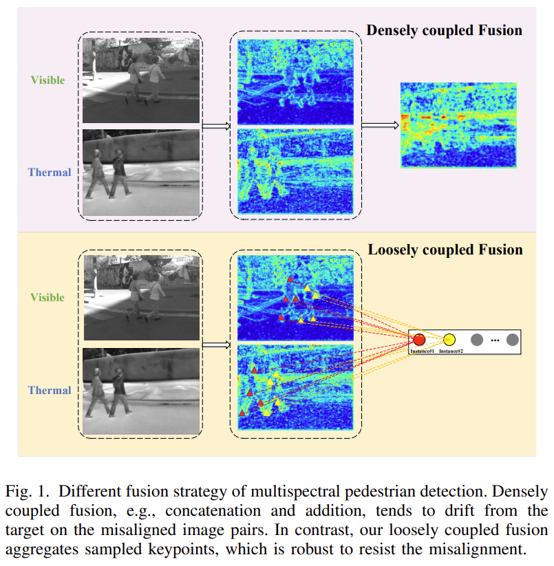 멀티스펙트럴 영상 데이터는 취득 과정에서 동일 장면에 대해 가시광 카메라와 적외선 카메라로 서로 다른 영상을 촬영하는데, 두 대의 카메라로 촬영하다보니 카메라 간 disparity와 각 파장대의 굴절률 차이 등으로 완전히 정렬된(Aligned) 영상을 얻기 어렵습니다. FLIR 데이터셋 같은 경우는 상당히 misaligned되어있고, align이 잘 맞는 데이터셋으로 분류되는 KAIST, CVC-14와 같은 데이터셋도 본 논문에서는 약간의 오정렬이 포함되어 있다고 합니다(KAIST데이터 같은 경우는 beam splitter를 이용해서 visible-lwir 간 alignment를 최대한 맞추었죠). 하지만 이렇게 misalign된 각 도메인에 대해 기존의 concatenation, addition과 같은 densely coupled fusion전략을 사용하는 것은 검출 성능 저하로 이어질 수 있습니다. 따라서 저자들은 이 대신 Figure 1과 같이 loosely coupled fusion 전략을 사용합니다. 각 도메인의 feature map에 그대로 dense한 fusion을 취하지 않고, 각 모달리티에서 몇몇 keypoint와 각 대응되는 attention weight를 sparse하게 샘플링하여 멀티 모달 특징을 적응적으로 모읍니다(adaptively aggregate). 이를 통해 자연스럽게 visible – thermal 각 모달리티 영상이 완전히 정렬되어있어야 한다는 조건을 피할 수 있게 됩니다.