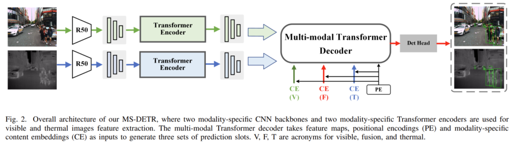 Fig. 2.와 같이 MS-DETR은 1.두 modality-specific CNN backbones, 2.두 modality-specific Transformer encoders, 3. 하나의 multi-modal Transformer decoder로 구성됩니다. 주어진 visible 영상 I^{V}, thermal 영상 I^{T}에 대해서 각 modality-specific CNN backbone에서 먼저 multi-scale feature map을 추출하고, 이 feature map들은 대응되는 modality-specific encoder로 입력되어 deformable self-attention을 통해 모달리티 별 multi-scale feature map을 집계하게 됩니다. 이 과정은 다음 수식으로 나타낼 수 있습니다 :