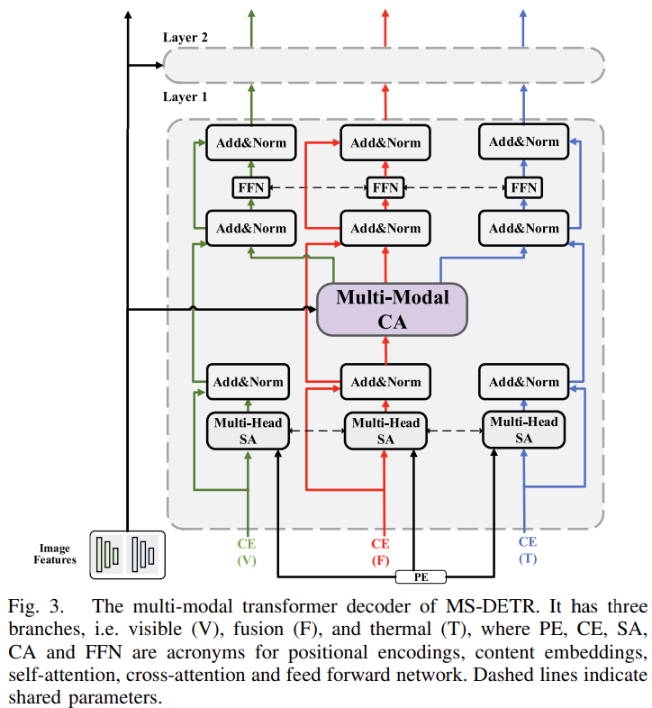 저자가 제안하는 multi-modal Transformer decoder 구조에는 visible(V), fusion(F), thermal(T) 3개의 branch가 있습니다. 따라서 3개의 content embeddings(CEs)가 있으며, 하나의 positional encoding(PE)를 갖게 됩니다. 각 layer에서 visible, fusion, thermal branch의 multi-head Self-Attention(SA)와 Feed-Forward Network(FFN)는 동일한 파라미터를 가지며, 모든 세 branch는 공동 multi-modal cross-attention(CA) 모듈을 공유합니다. 제안하는 loosely coupled fusion은 multi-modal cross-attention(CA)모듈에서 수행됩니다.